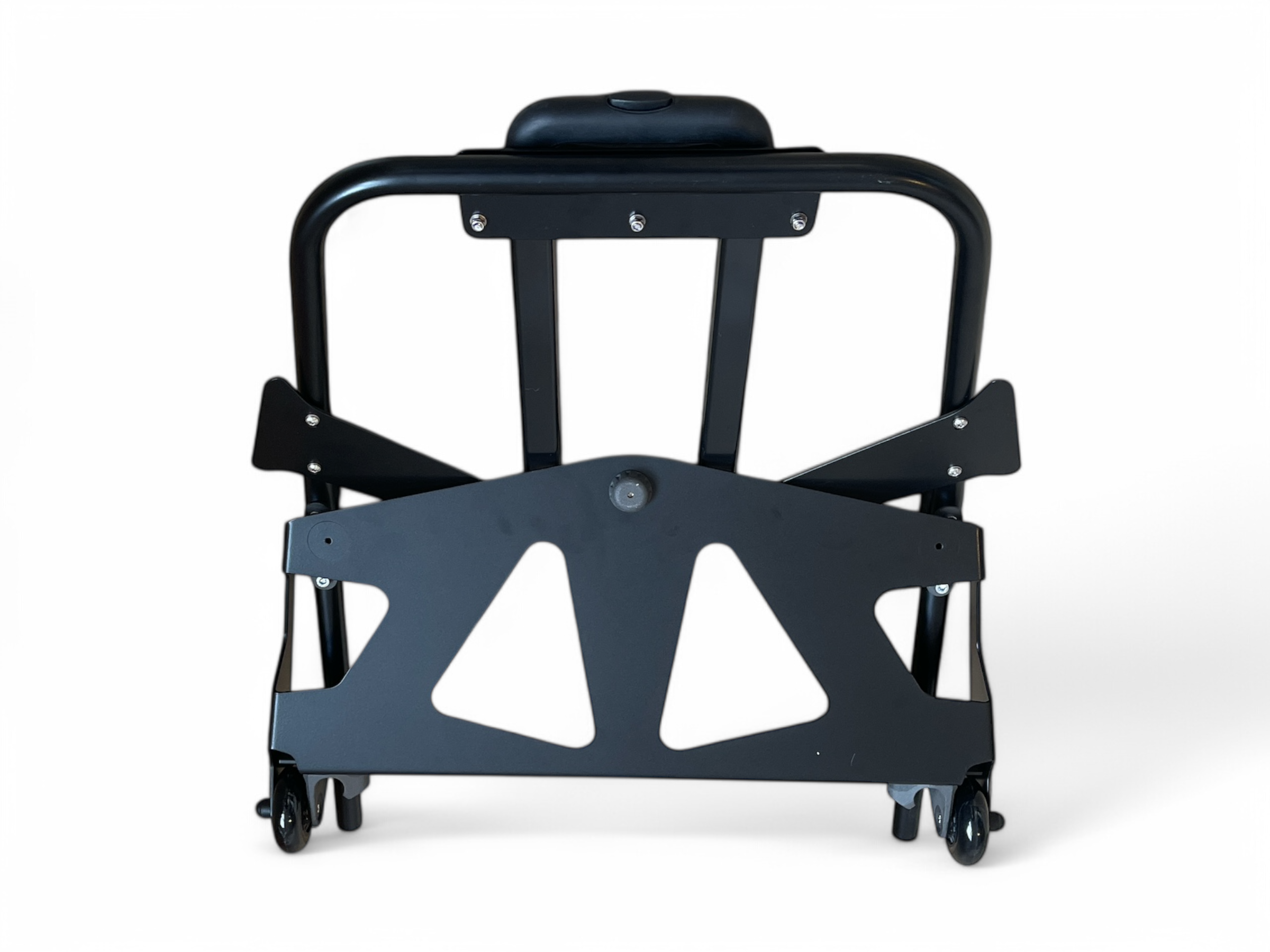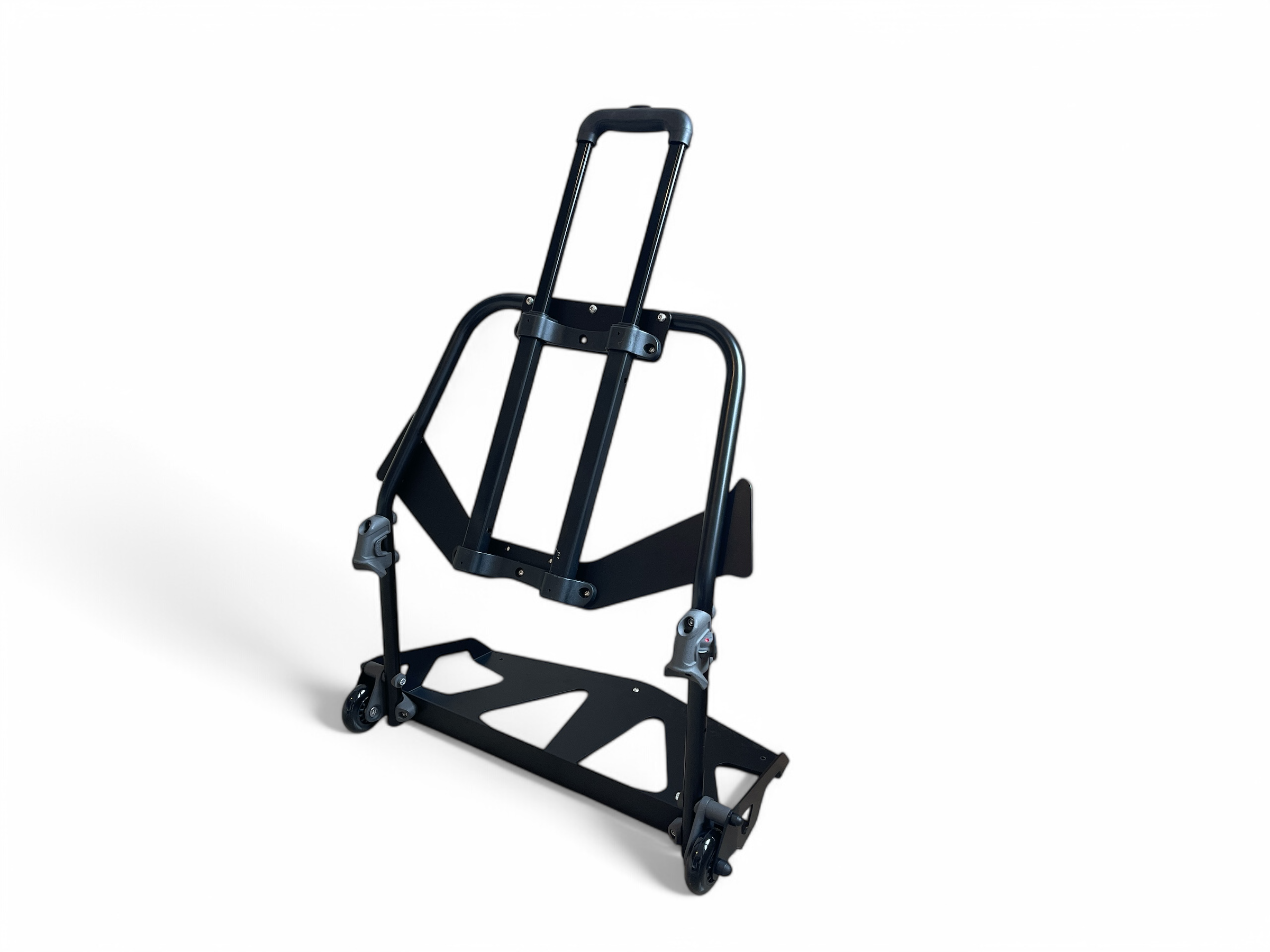 Ein Gepäckträger mit Rollen und ausklappbarem Griff, der hinter dem Sitz befestigt wird und schwer beladen werden kann,